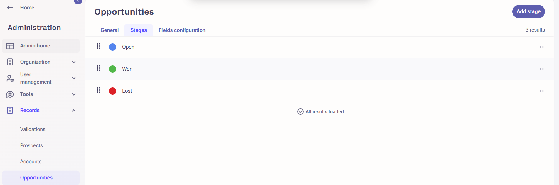 - Once the Stage/Status values have synced to Outreach and the record mappings have been established, review the stages in the Records>Opportunities>Stages section to determine which stages should remain as Open and which ones should be modified to reflect Closed Won or Closed Lost