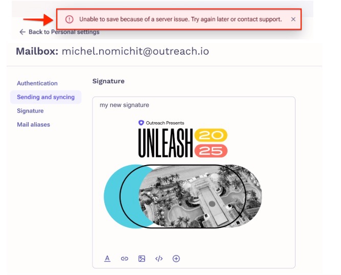 An error is showing up when trying to save new signature, indicating "Unable to save because of a server issue. Try again later or contact support".