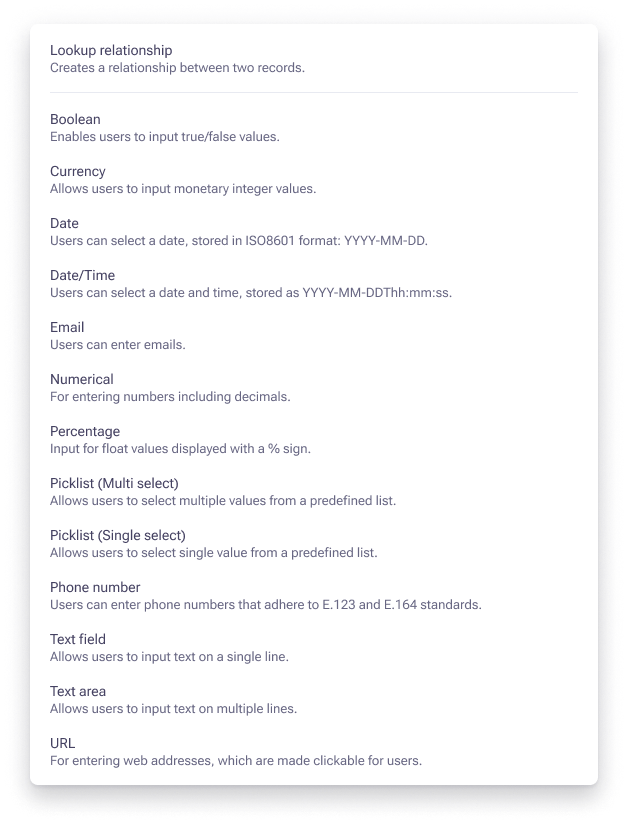 What types of fields can be added to custom objects?