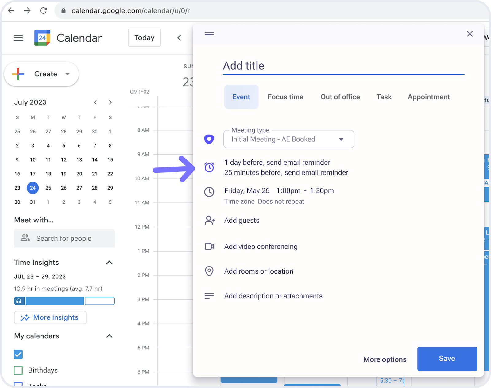 Meeting reminder in Google Calendar:
