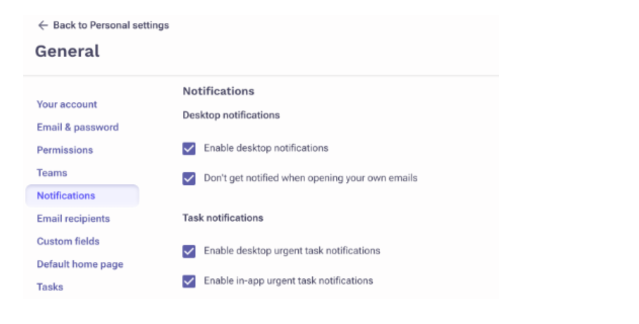 Users can update their personal settings to enable urgent task notifications on the desktop and/or in-app. Settings are located under Personal Settings -> General -> Notifications -> Task Notifications. Users are opted-in to desktop notifications and opted-out of in-app notifications by default.