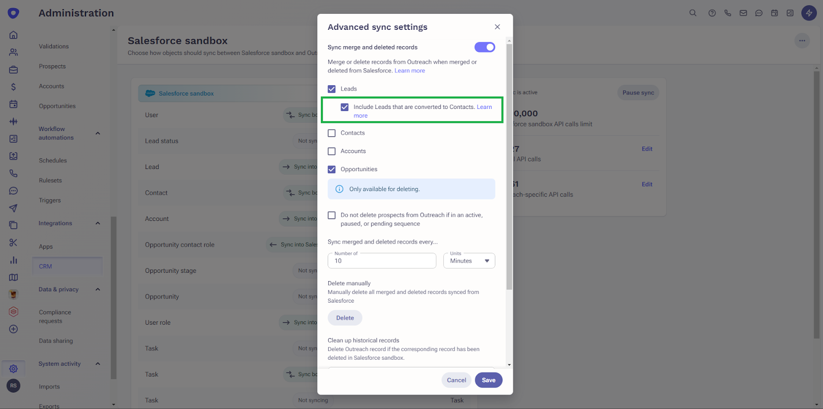 - Maintain data integrity by automatically syncing deleted opportunities using Outreach CRM Sync
