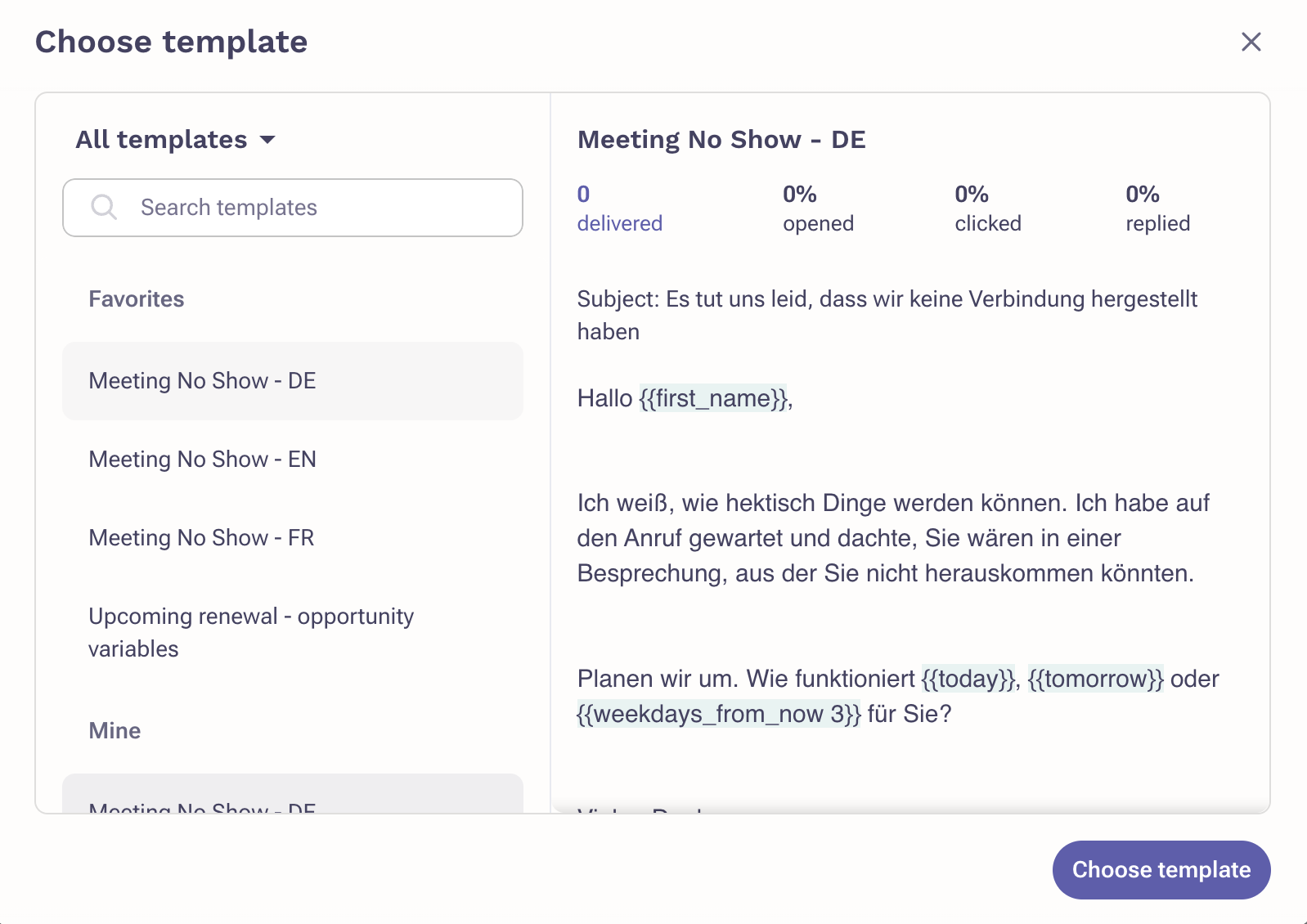 Now users will be able to see a full preview of the template or snippet. For templates, users will also be able to see the performance metrics such as number of deliveries, open/click/reply rates.