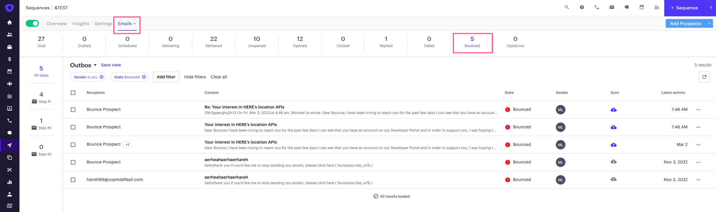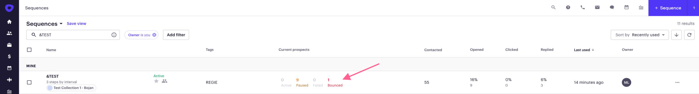 To find the number of how many emails sent from that sequence bounced, you would look at the Sequence report for Emails instead. The Bounced state here calculates how many emails sent to prospects in that sequence have bounced.