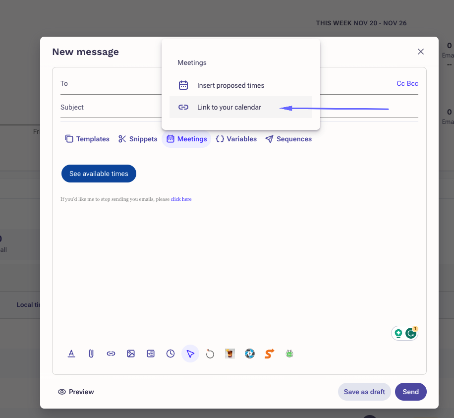 Easily add your public calendar link in the Outreach email compose and the Universal task flow.