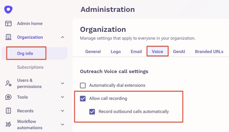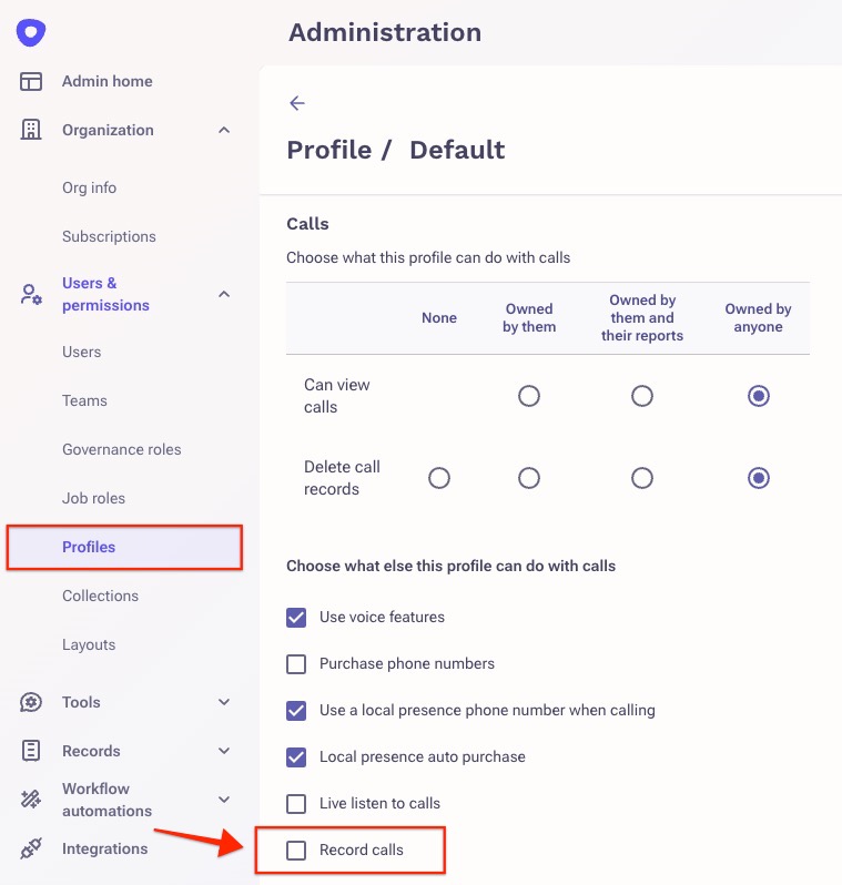 The next place you will want to check is the governance profile(s) of the user(s) who will be making outbound calls from Outreach using Outreach Voice. Under the 'Calls' section, you want to enable the 'Record Calls' option and save the profile.