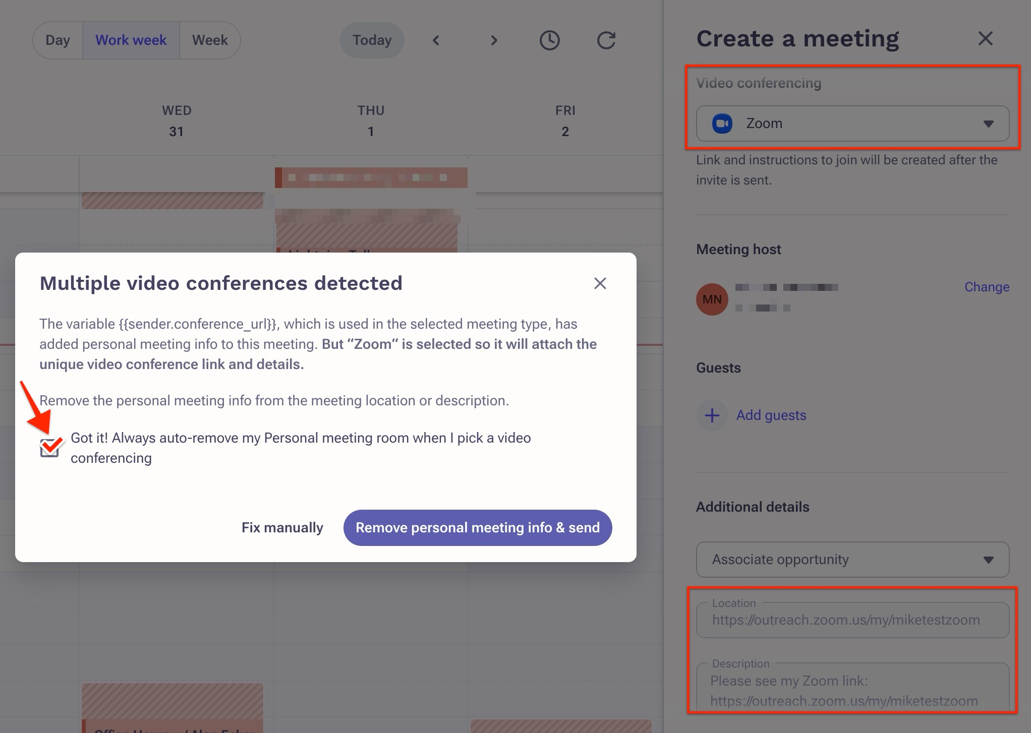 Outreach recommends creating duplicated of meeting types with and without {{sender.conference_url}} or {{sender.conference_details}} variables. Or removing the {{sender.conference_url}} or {{sender.conference_details}} variables if they should no longer be used.
