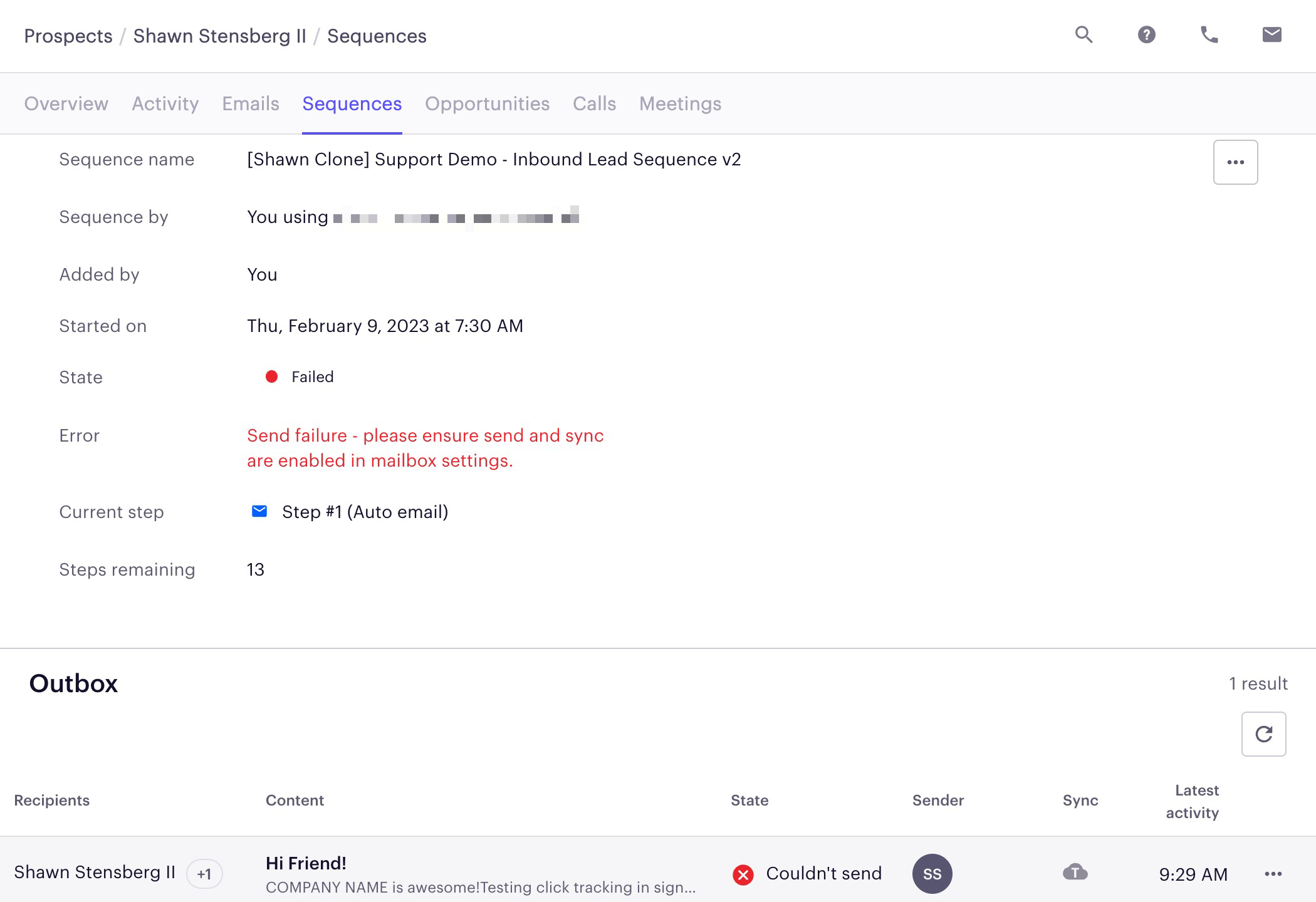 Your sequence email step fails with the error message: Send failure - please ensure send and sync are enabled in mailbox settings.