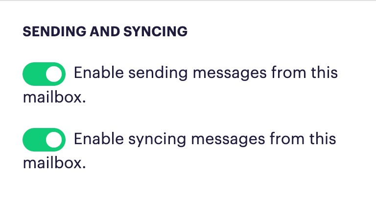 Navigate to your mailbox settings by clicking on your initials in the lower left-hand corner of the screen, click the Mailboxes tab, and click Edit next to the appropriate mailbox. Ensure that the send and sync settings are green (enabled). If they are grey, click the icons to turn them green.