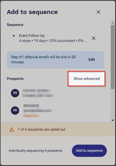 4. In the Add to sequence window, select the applicable sequence to add the Prospect(s) to.