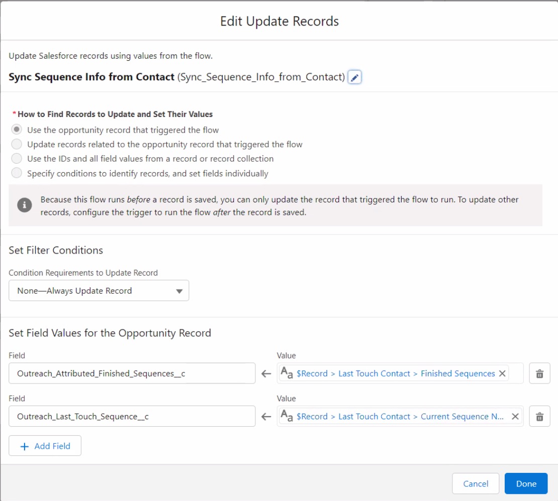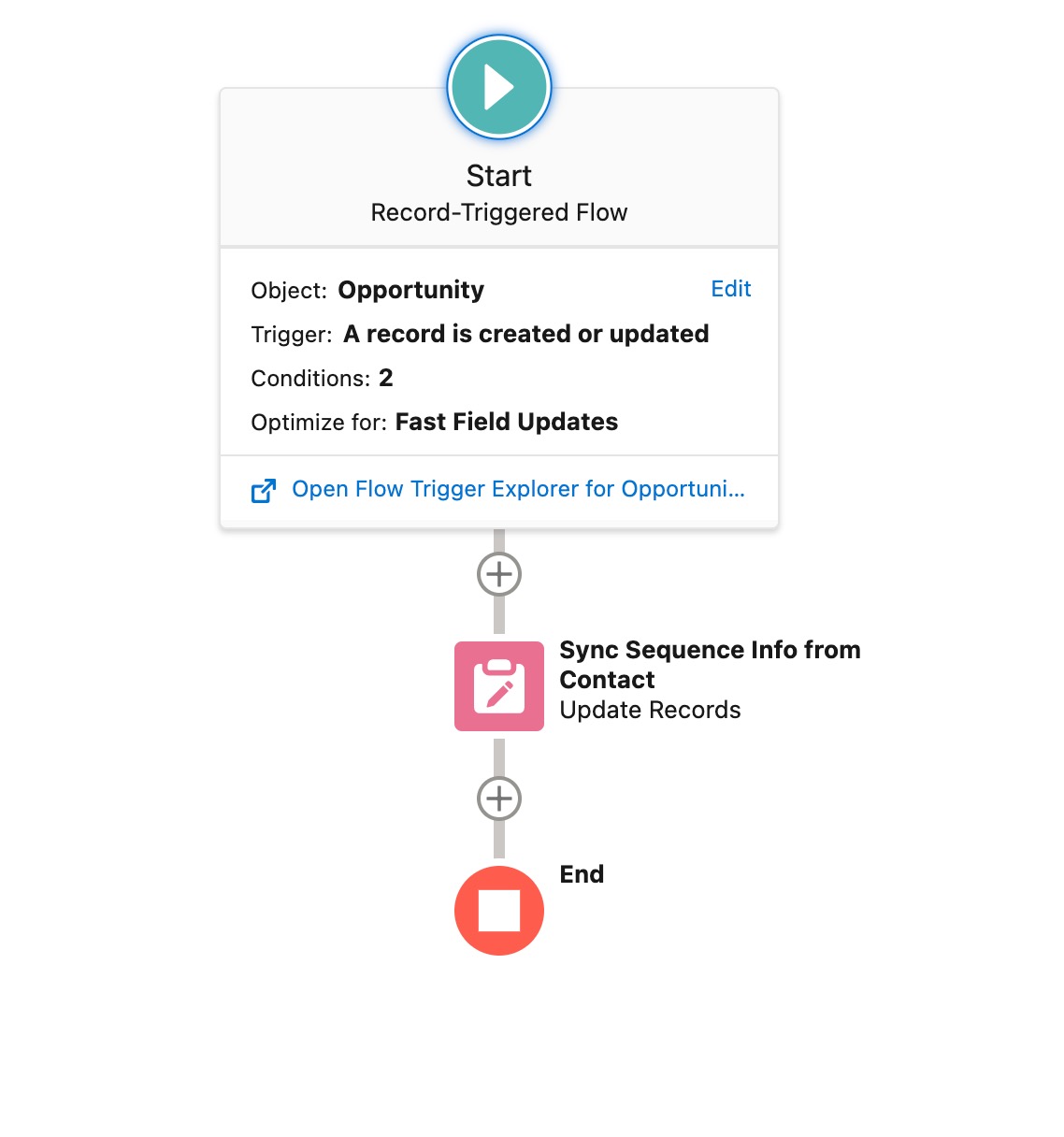 Element: Data > Update Records (drag and drop onto flow) Label: Sync Sequence Info from Contact How to Find Records: Use the opportunity record that triggered the flow Condition Requirements: None - Always Update Record Field 1: