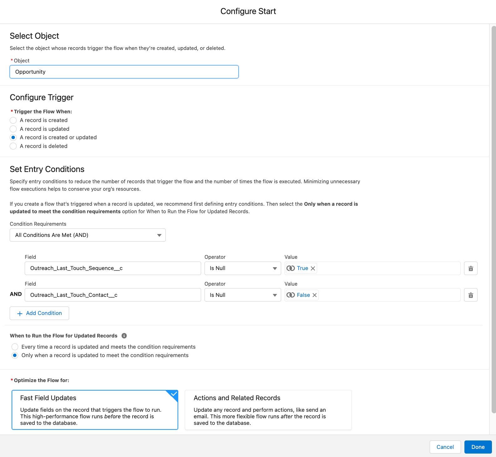 This flow runs when a user associates a contact to an Opportunity via the Last Touch Contact field. Upon this action, Last Touch Sequence Attribution will transfer the value from the current sequence name field, and a comprehensive list of all sequences the contact has been in to fields on the Opportunity record.