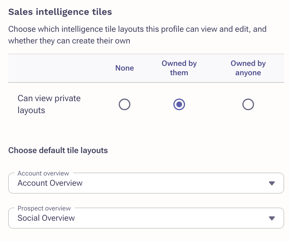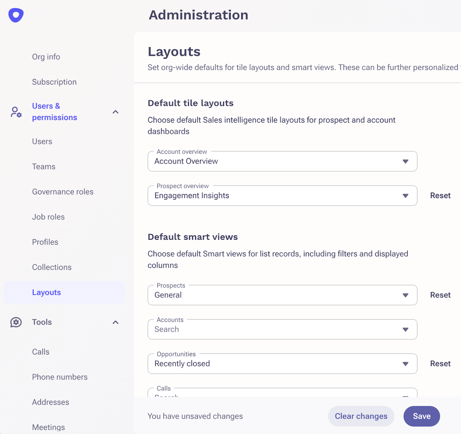 - Choose the default layouts for Prospects or Accounts. This selection will be the first view users see upon navigating to those pages.