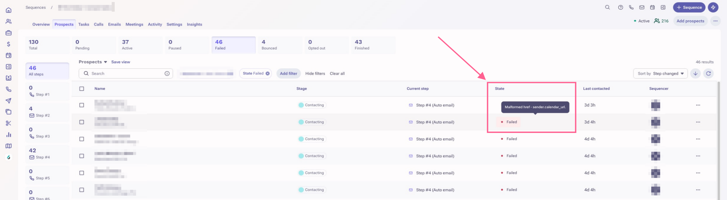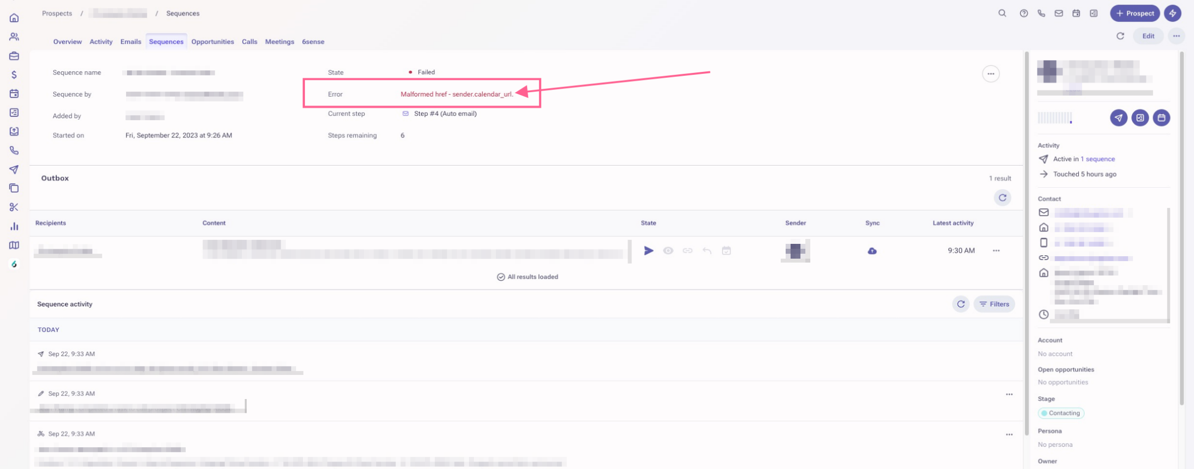 You've added prospects to a sequence but they're now in a Failed sequence state. The failed error message is: Malformed href - sender.calendar_url