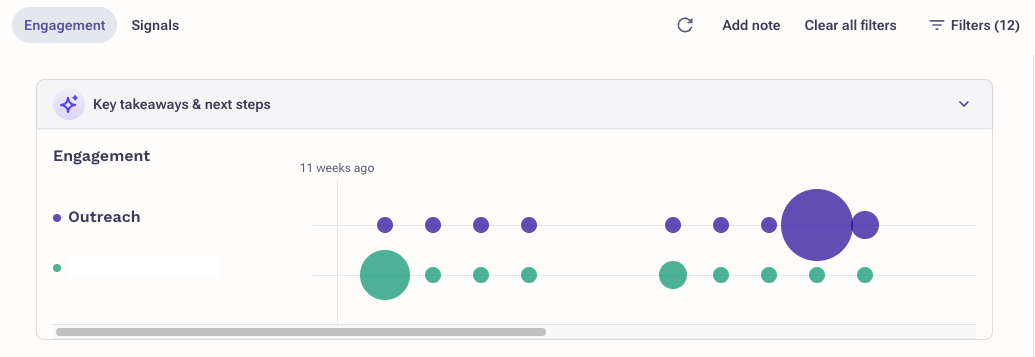 • Instantly see which days had the most or least engagement with an account. Larger bubbles indicate higher activity, helping you spot periods of strong or weak outreach.