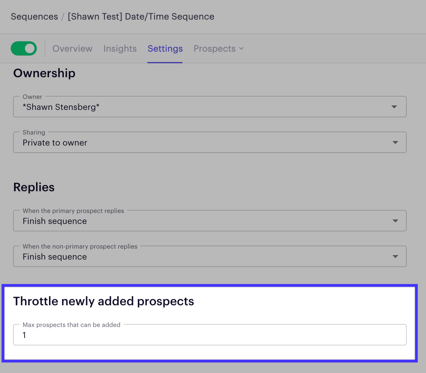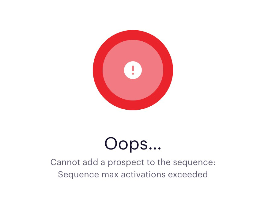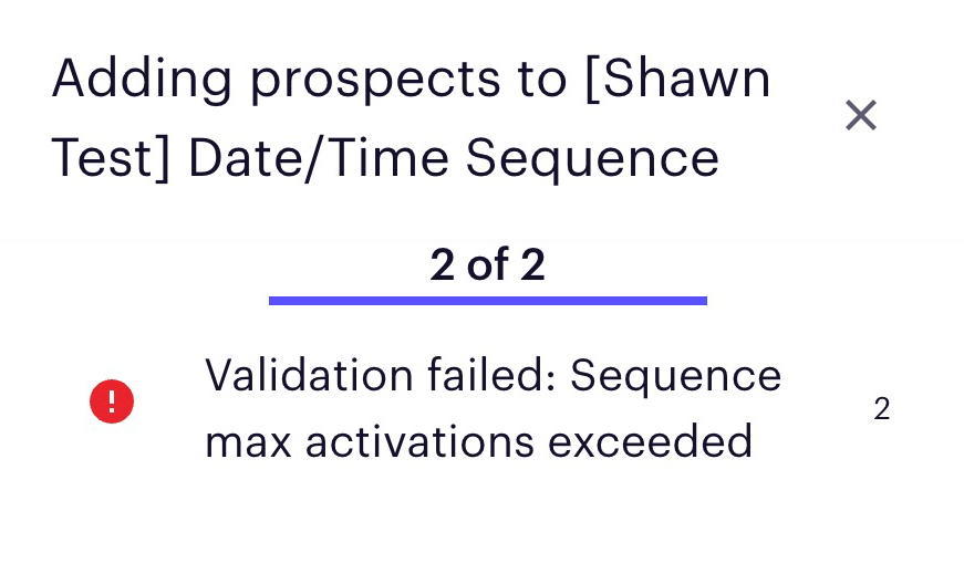 Adding prospects to an exact date/time sequence results in either error Validation Failed: Sequence max activations exceeded or Oops...Cannot add a prospect to the sequence: Sequence max activations exceeded.