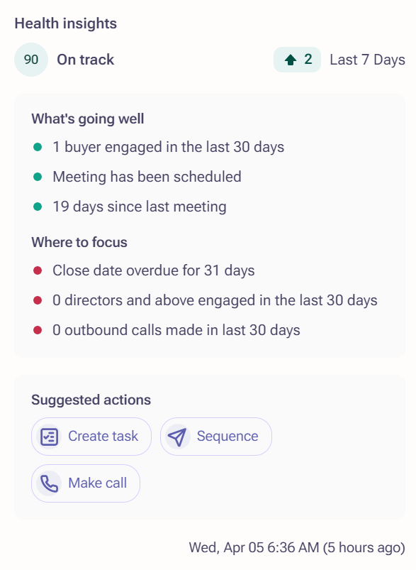 When hovering over a Deal Health score, next to the current score trend information is displayed on how the score has changed since last week and in which direction (positive, negative or no change).