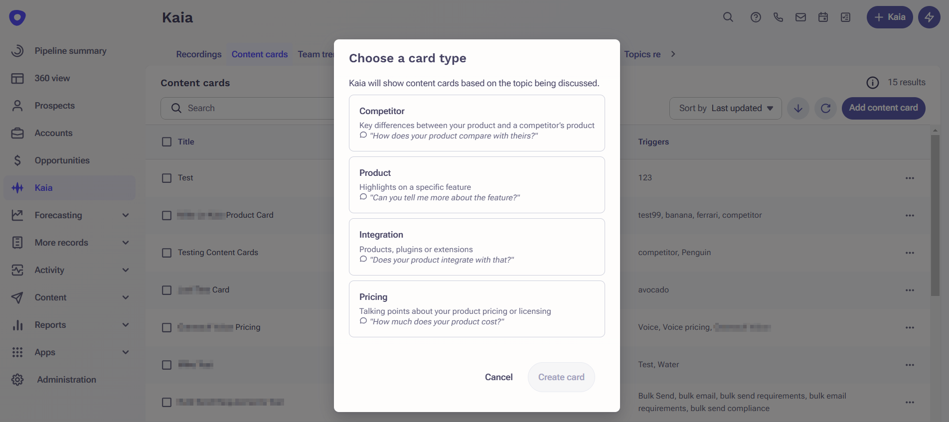 Triggers - An audible word that, when uttered in a Kaia meeting, will automatically surface the corresponding Content Card for the rep.