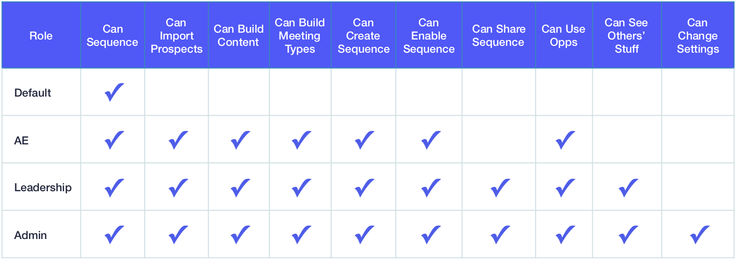 AEs have slightly more access than SDRs do. There’s a few permissions that need to be changed for AEs, primarily the permissions around Opportunities and managing content.