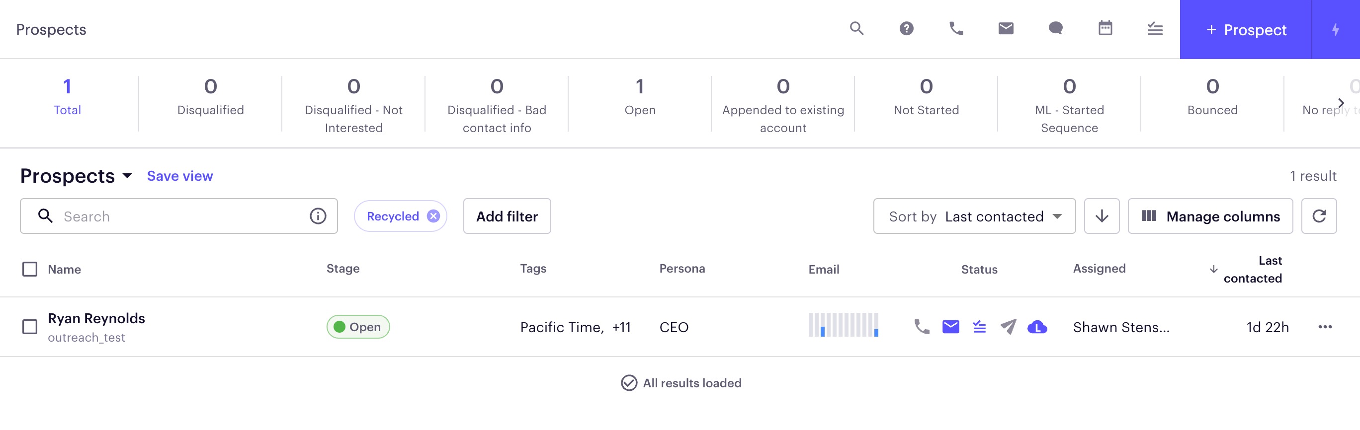 To resolve the issue, navigate to Outreach and then to the main prospects page. From there, filter for Recycled prospects (shown below).