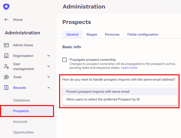 Allow users to select the preferred Prospect by ID - When a Prospect being imported has the same email address as an existing Prospect in your Outreach org, the user executing the import will be presented with the option to select which Prospect to retain in the system.