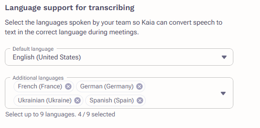 - Kaia supports one main language and up to 9 secondary languages to enable users to see real-time transcription for their Kaia meetings.