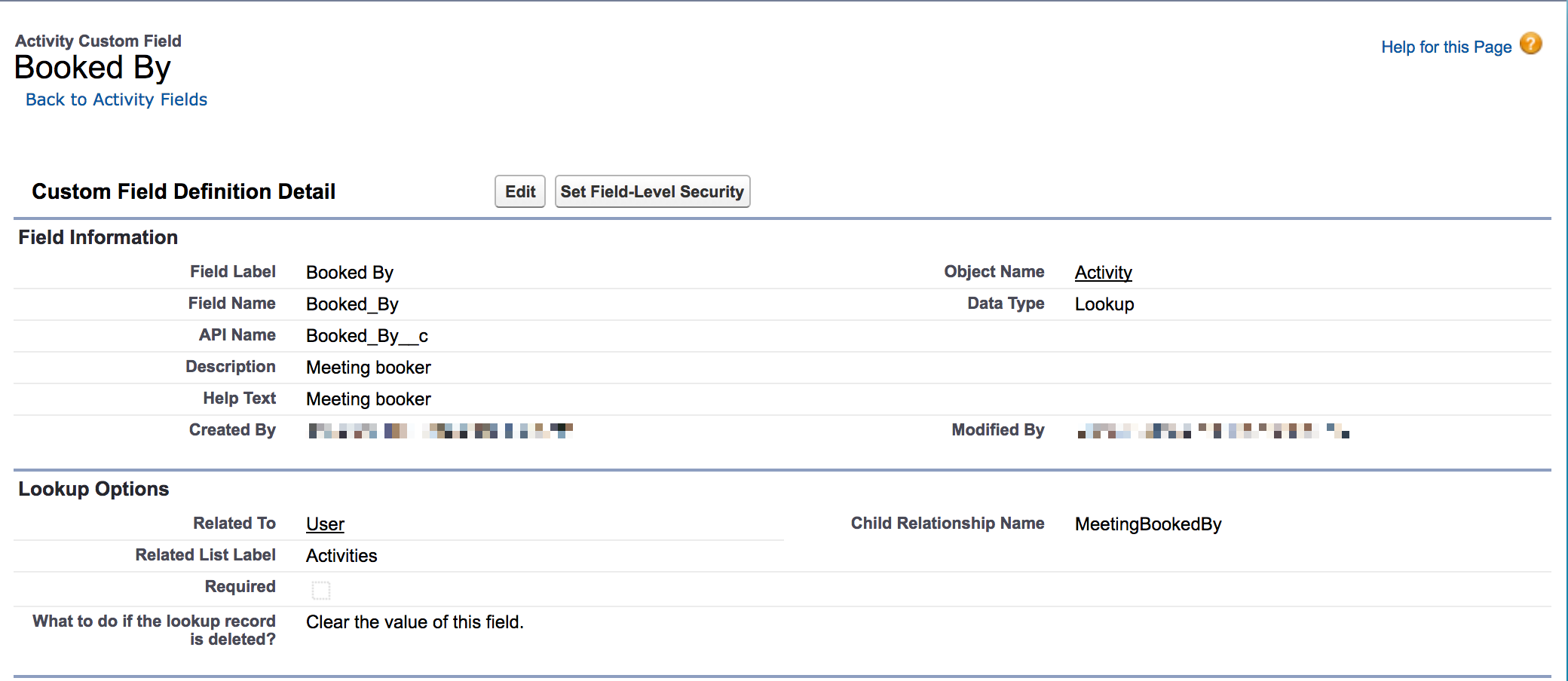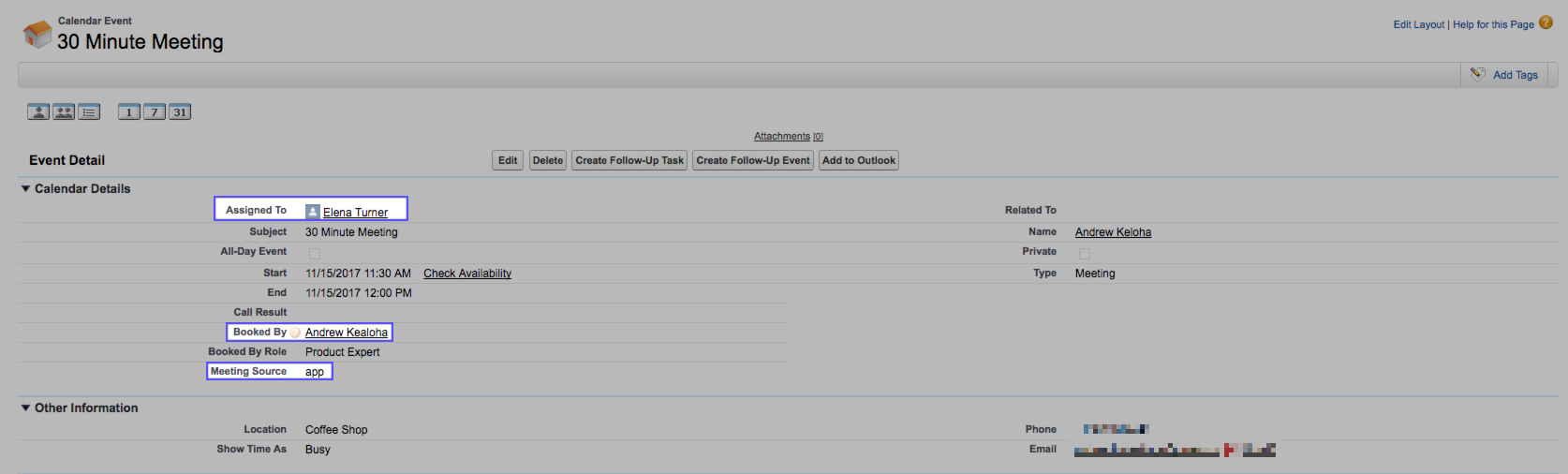 - Booker - Displays the actual User who booked the meeting. For example, if a SDR booked a meeting on behalf of an AE, the AE's name appears in the Assigned To field, and the SDR appears in the Booked By field in the Event Page layout.