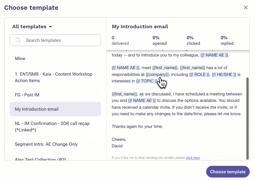 The selected template appears in the body of the email for additional input and customization as applicable.
