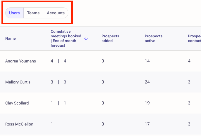 • Outreach forecasts the total number of booked meetings for each User, thus the forecast cannot be broken down by meeting type, prospect persona, account, etc.