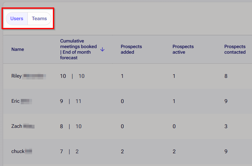 Users can pivot the table view to aggregate by either individual users, teams, or accounts. The export CSV output will reflect the current view on the table.