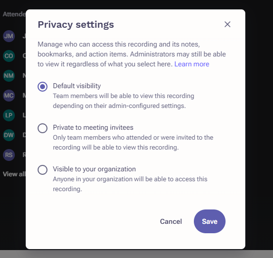 • Default visibility - Team members will be able to view this recording depending on their admin-configured settings.