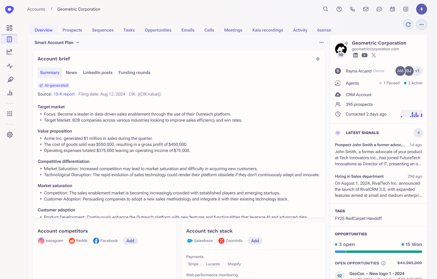 - Research and Enrichment: Enrich your prospects and accounts with third-party data and signals from trusted vendors, saving your reps research time. Use the signals to filter prospects and accounts in list views.