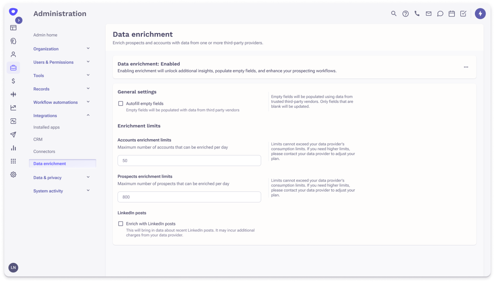 - Enrichment limits: Set the maximum number of prospects and accounts that can be enriched per day.