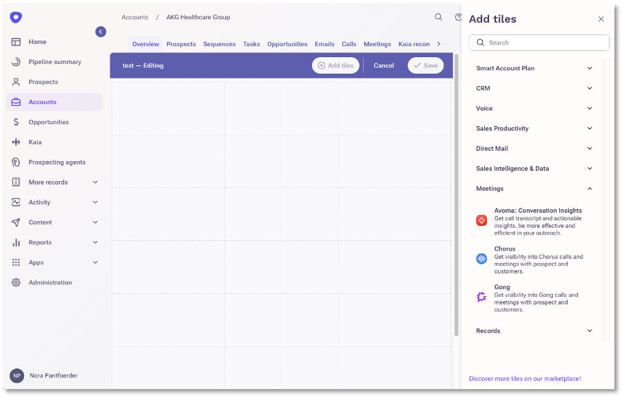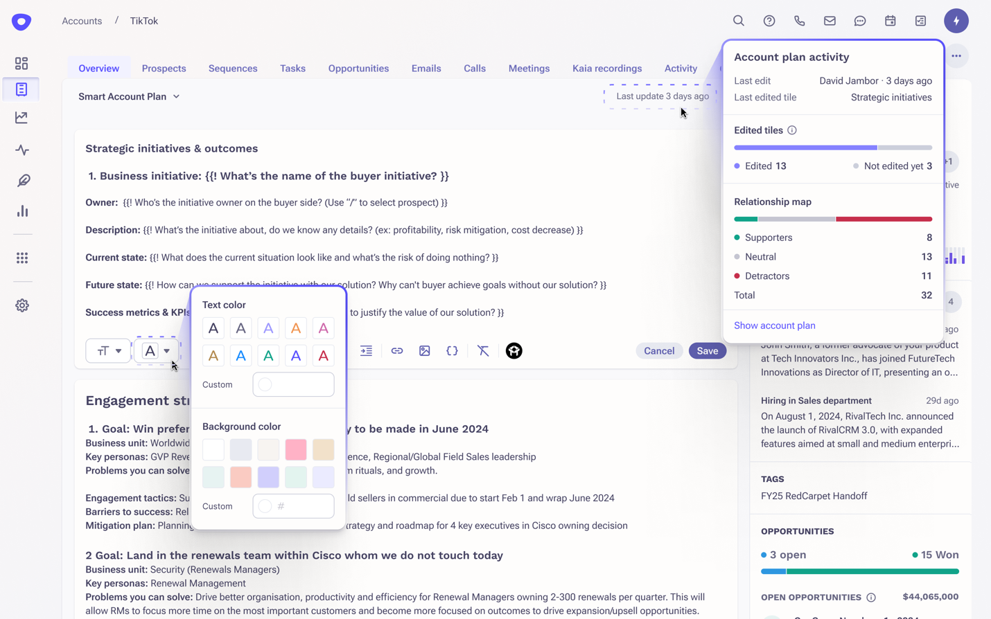 A new “Account Plan Updated” column in the accounts list page displays key information such as which tile was last updated, who made the last update and when, which tiles have been changed or not touched, and how many prospects were added to the Prospect Relationship Map, broken down by sentiment.