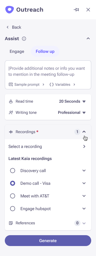 In the Outreach extension for Outlook, access this feature from an email compose window (new email or reply), click the "Assist" button, and choose "follow-up" email type. Choose a meeting recording from the list of Kaia recordings, optionally add any other inputs, hit “Generate" and send it to the meeting participants.