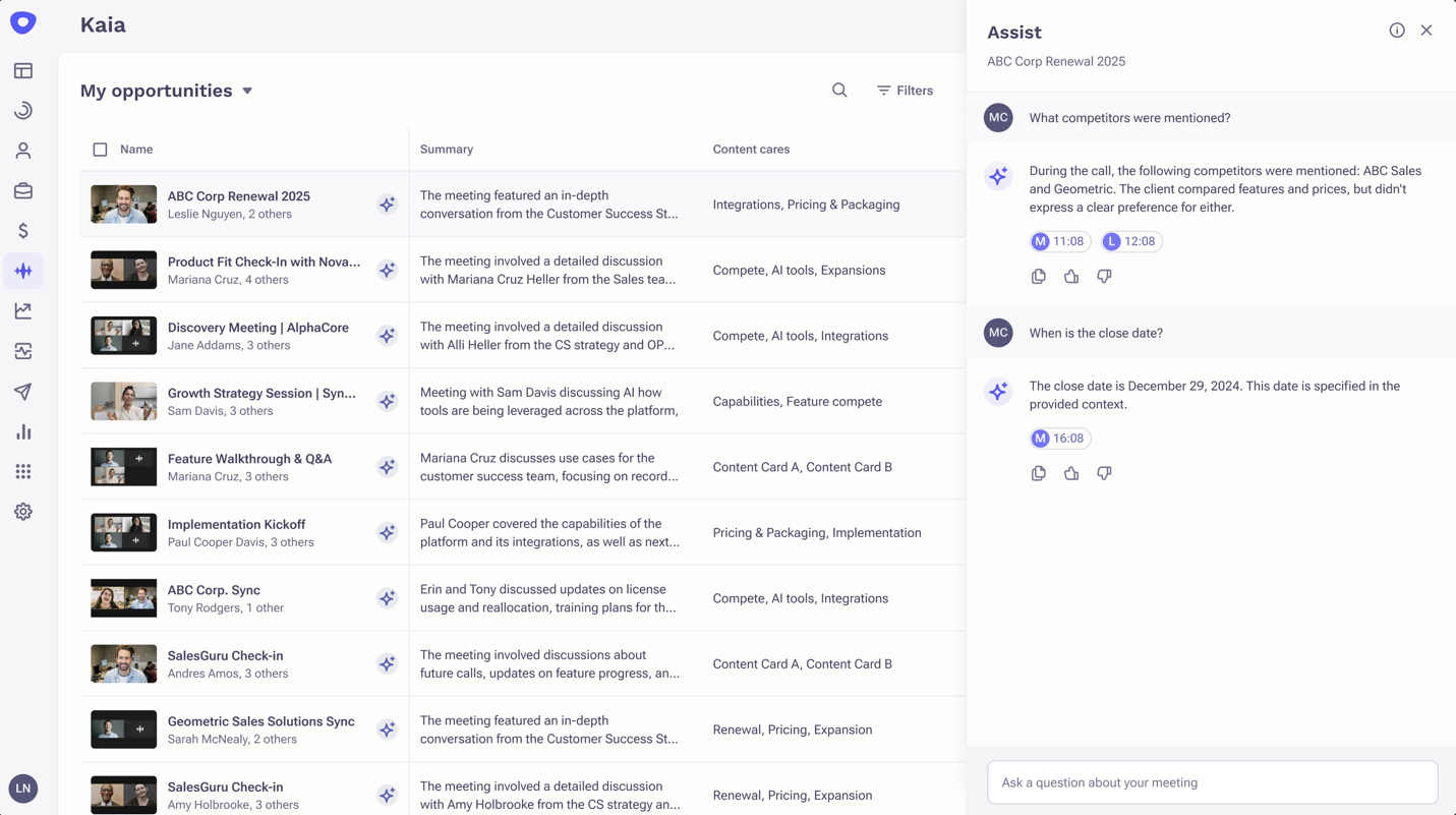 This new Tile summarizes your most recent Kaia meeting by surfacing the meeting summary, topics discussed, participants, and provide a click through to view all recordings.