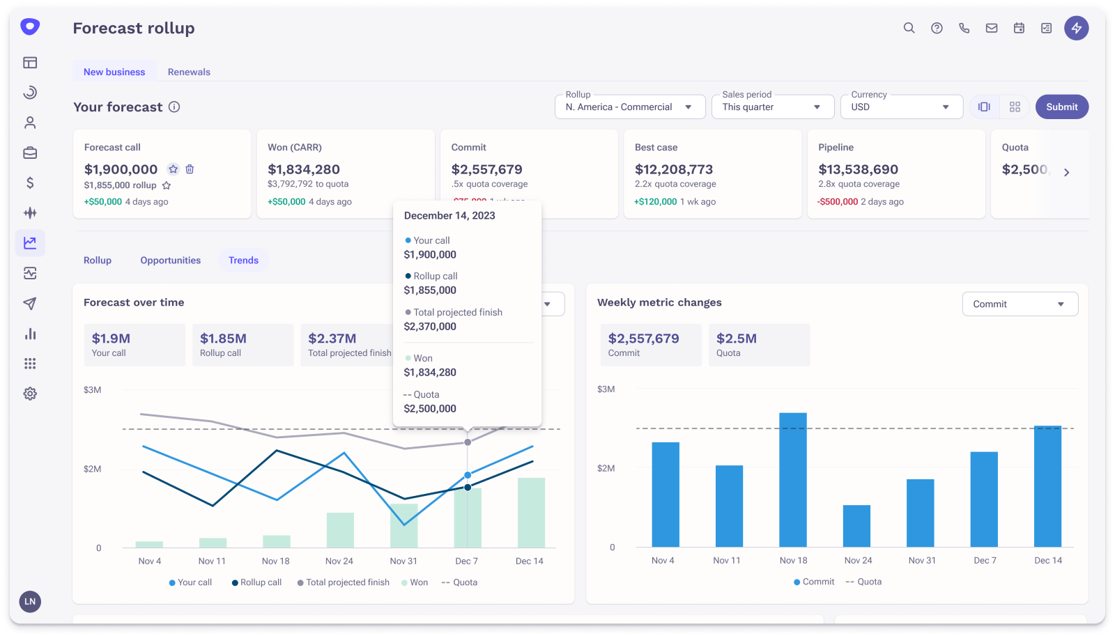 Forecast Trends help revenue leaders and sales managers better understand forecast dynamics, identify risk early, and improve forecast accuracy. It includes the following components: