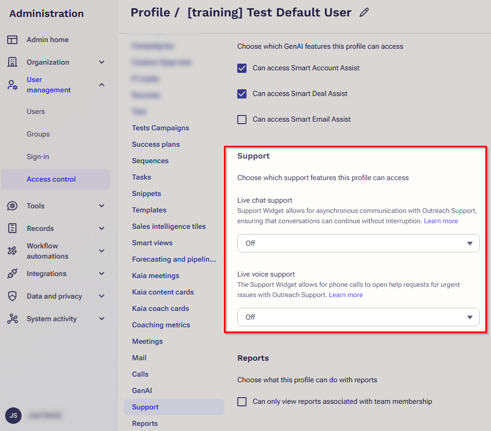 Control which users have access to Outreach Chat and Voice Support using Profiles.