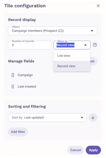 - Record View for the Related List Tile: A new display option for the Related List Tile shows each related record in a stacked layout, with fields arranged as rows. This is ideal for viewing detailed data like engagement metrics or product usage in a cleaner, more readable format.