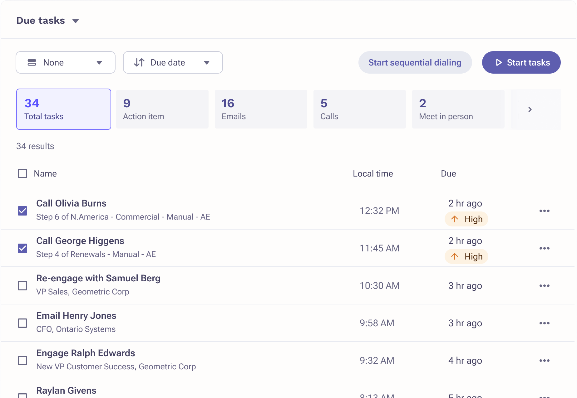 You can access sequential dialing from 2 places - your home page, or your task list view. When you begin to select tasks to take action on, you will see the Start sequential dialing button next to Start tasks. Note: the sequential dialing button will only become active once 2 or more call tasks are selected.
