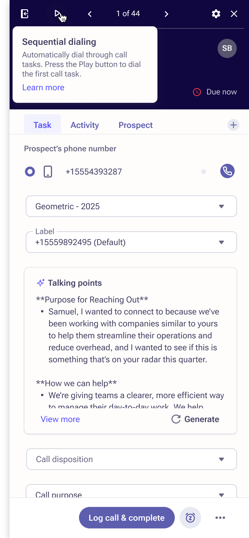 If a prospect answers a call, sequential dialing mode will be automatically paused allowing you to have a conversation with the prospect and log it normally. Once logged, you will need to click the play button again to continue sequential dialing.