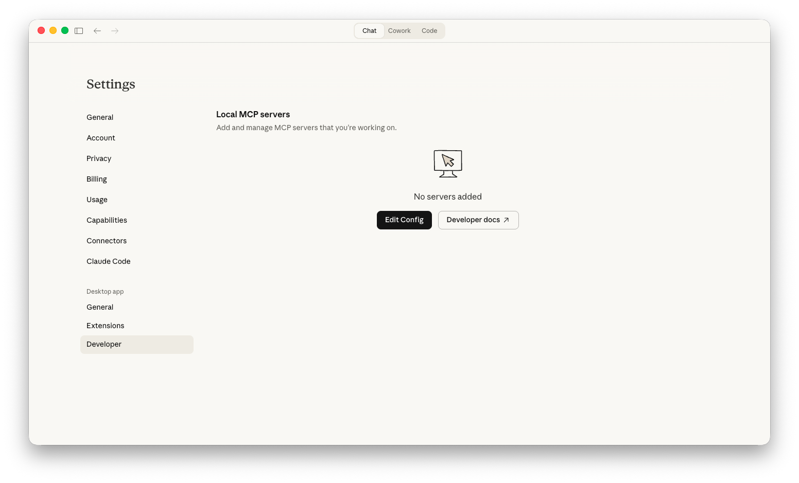 To do this, go to Claude > Settings > Developer (under Desktop app section) > Click on Edit Config: