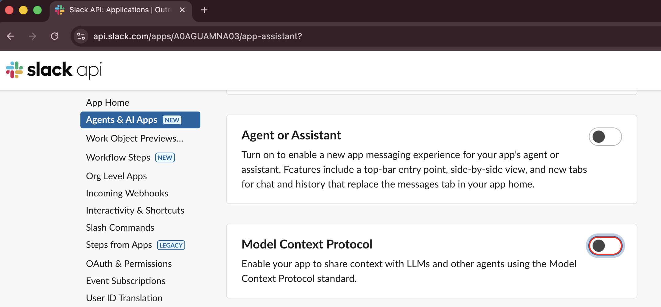 To create a new app, go to https://api.slack.com/apps > Create an app or pick an existing App > App Settings > Agents & AI Apps > Model Context Protocol and enable the setting: