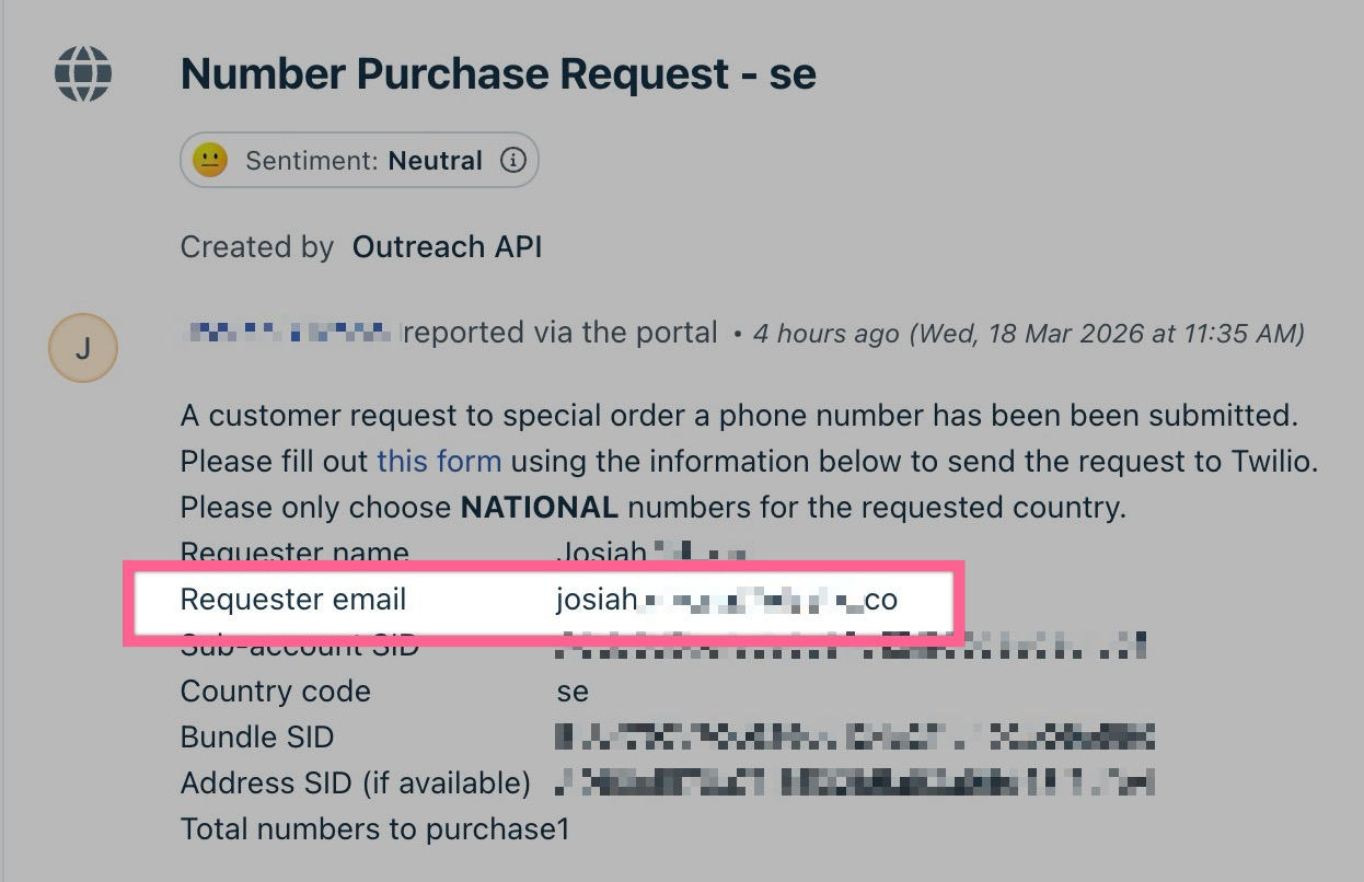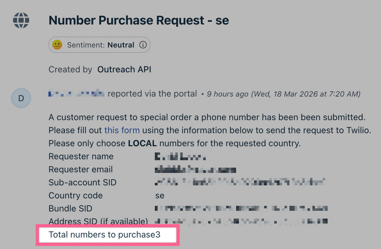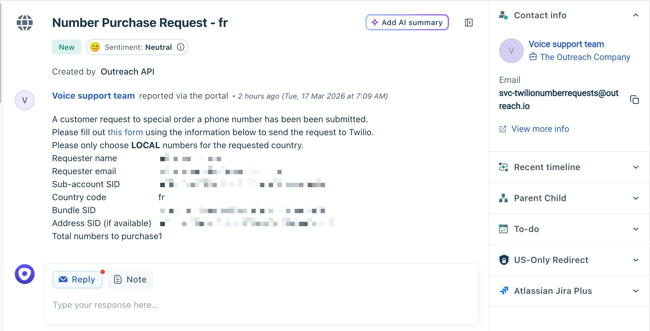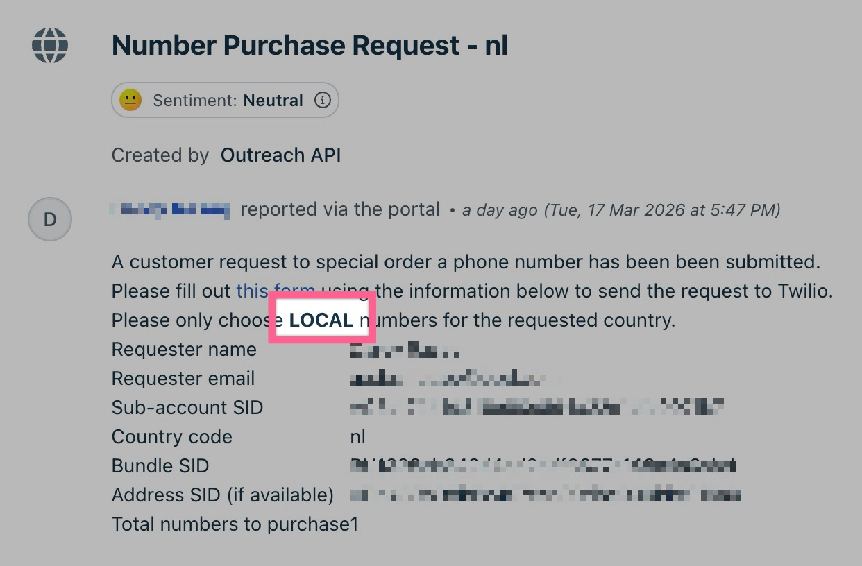 - Customer has submitted a special number order or private offering request, and you need to process this for them with Twilio. They normally submit these when they can't do it in the portal or there are no avaialble numbers, therefore they're prompted in Outreach to submit a request like this to us, which we'll receive via the API as a Support ticket.