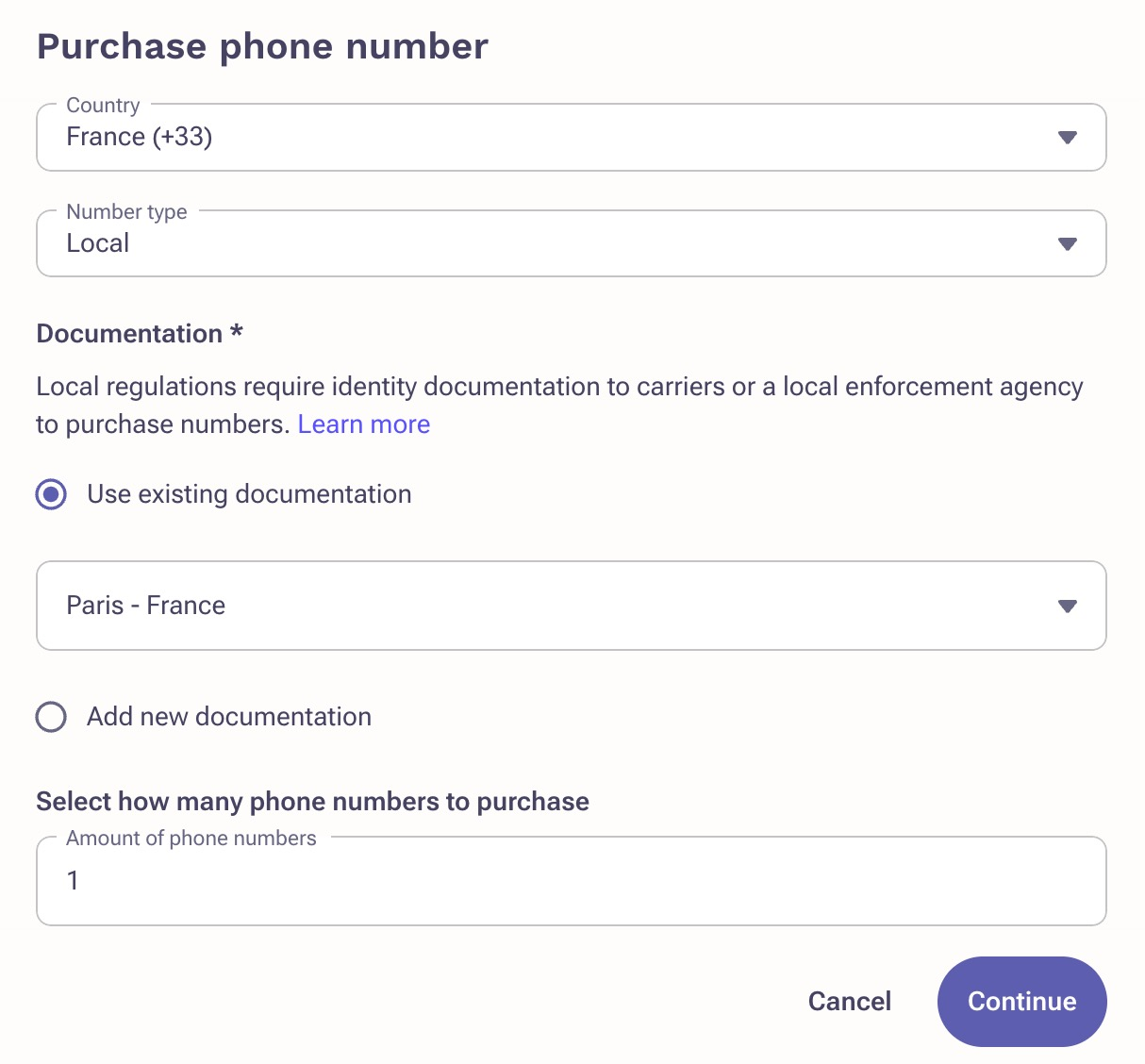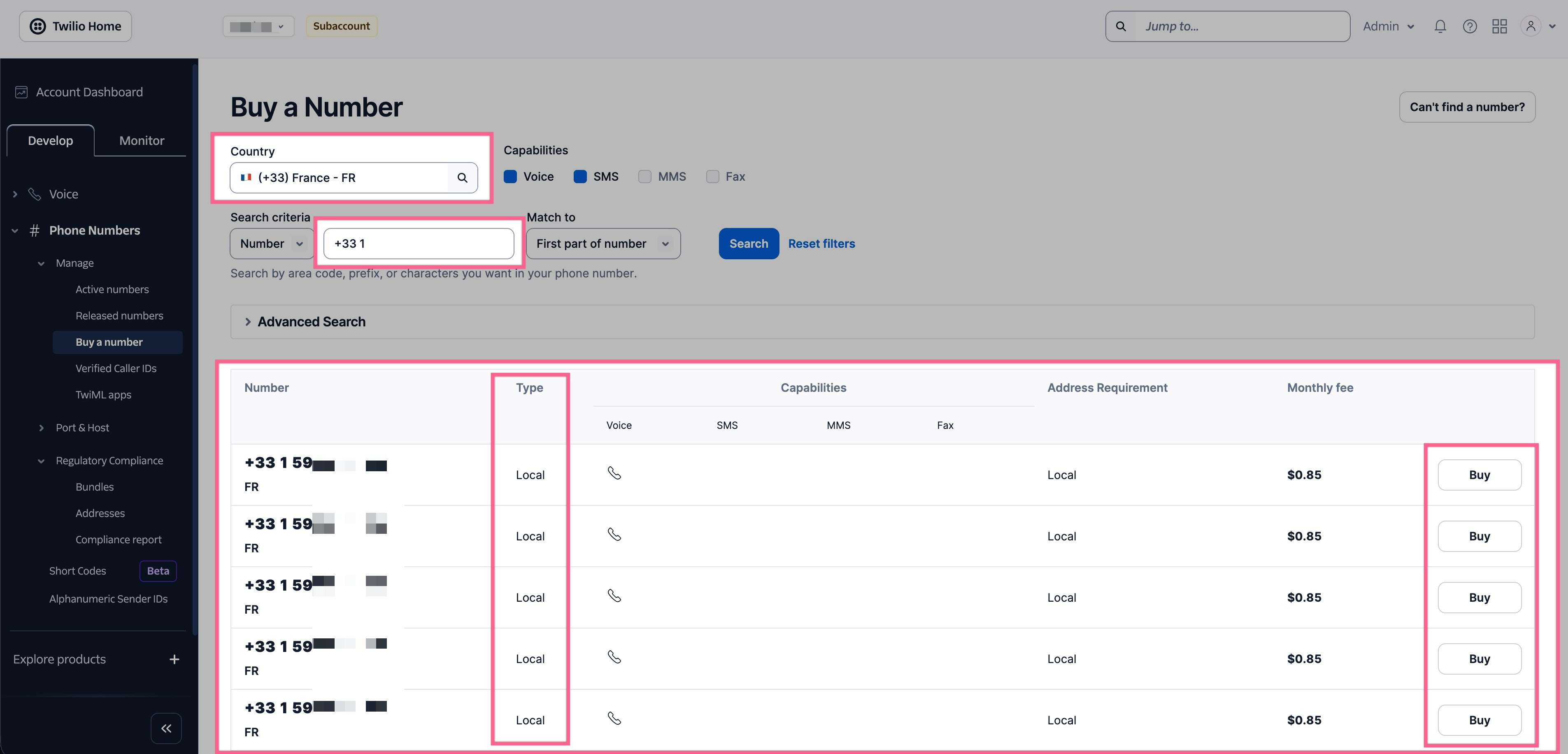 - Confirm the country and area code matches the results, and the phone number type is accurate for what they're requesting, and click Buy to the right of the number.