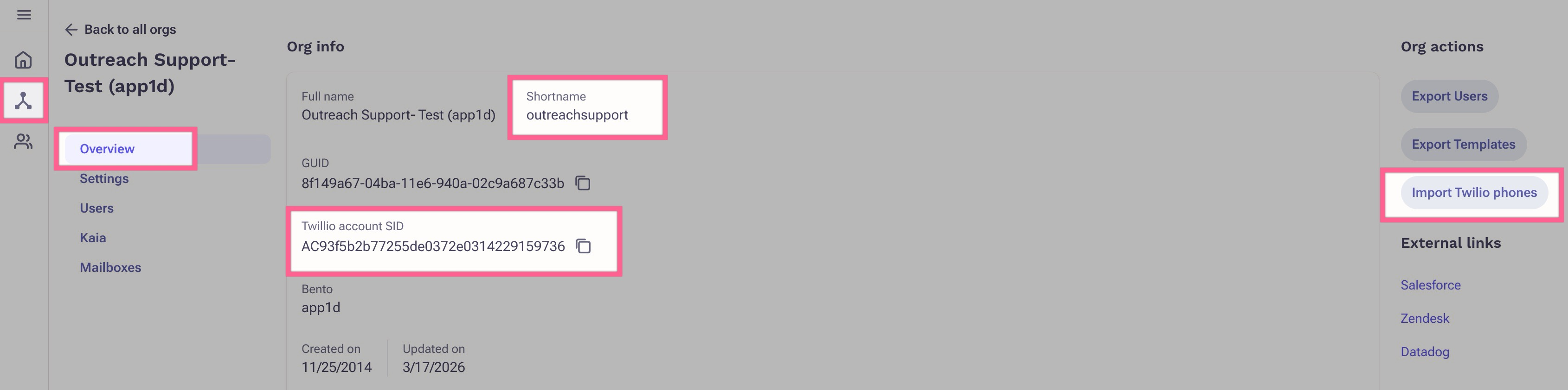 - Once you're updated with Twilio and they confirm the numbers have been purchased and processed, go to the Org in the Support Admin Portal, and on the Overview page, click on Import Twilio phones to import those Twilio numbers into their Outreach instance.