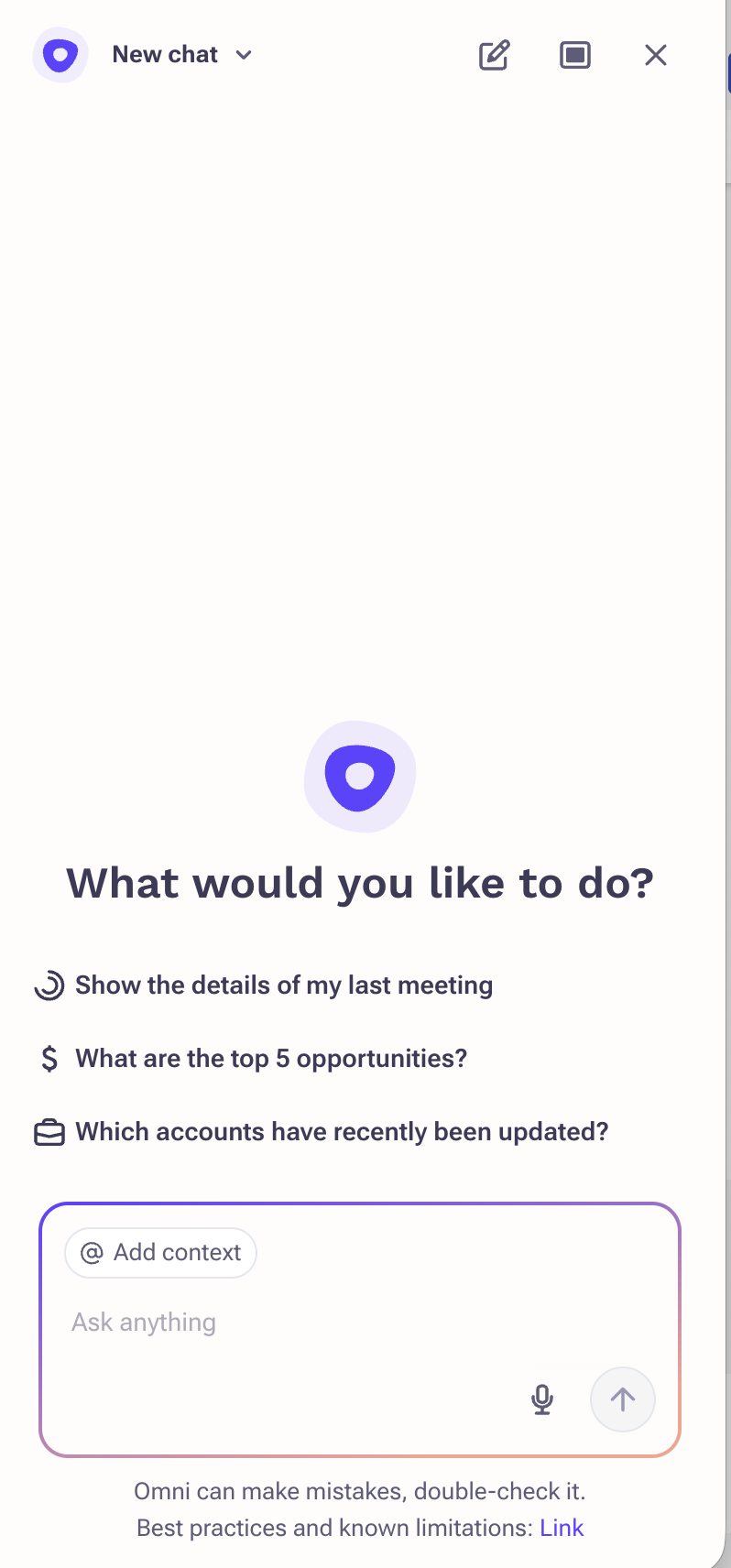Omni is an AI-native conversational agent that gives sellers context-aware, multi-turn access to Sales Intelligence across the Outreach platform. Instead of navigating across records, reports, or recordings, users can ask natural language questions and quickly surface relevant insights, context, and actions tied to their sales workflow.